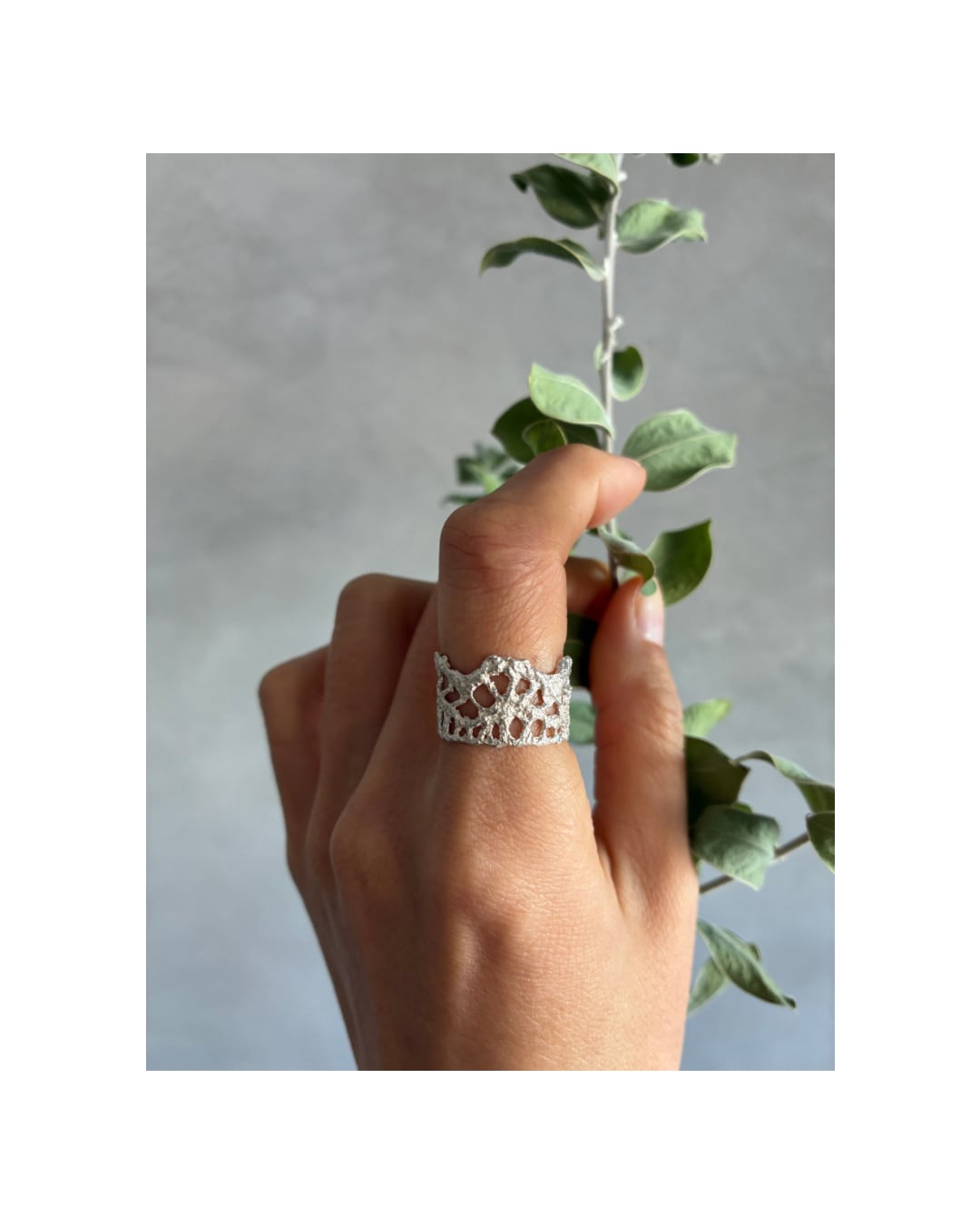 Etra-エトラ- lace レースが持つ繊細な質感をそのまま形にしたいと思い立ち、特殊な技法で金属に鋳造しました。 レース特有の編み目の絶妙な抜け感がとても清楚。 反面しっかりと重量感ある雰囲気を併せ持ち、でも実は軽い。 金属化することで、糸の状態では成し得ない 耐久性も備わりました。 糸が持つ繊細さと金属ならではの煌めき、 そしてアンティークのような、長く大切にしたいデザインをぜひお楽しみください。 素材: シルバー925 サイズ: 14号 ※内側も糸の質感そのままのデザインにしておりますので、一般的な内側がフラットに磨かれたデザインよりも若干サイズが小さく感じる方が多いように感じます。 サイズに迷われましたら、ジャストサイズよりも若干大きめを選ばれることをお勧めいたします。 ------------------------------------- Etra -エトラ- シリーズとは 元素になる前 一度自然に還し、元素的に再構成する という意味を持っています。 異なる物質に変化させることで 長く長く愛されるジュエリーとなることを願い 一点一点心を込めてお作りしています。