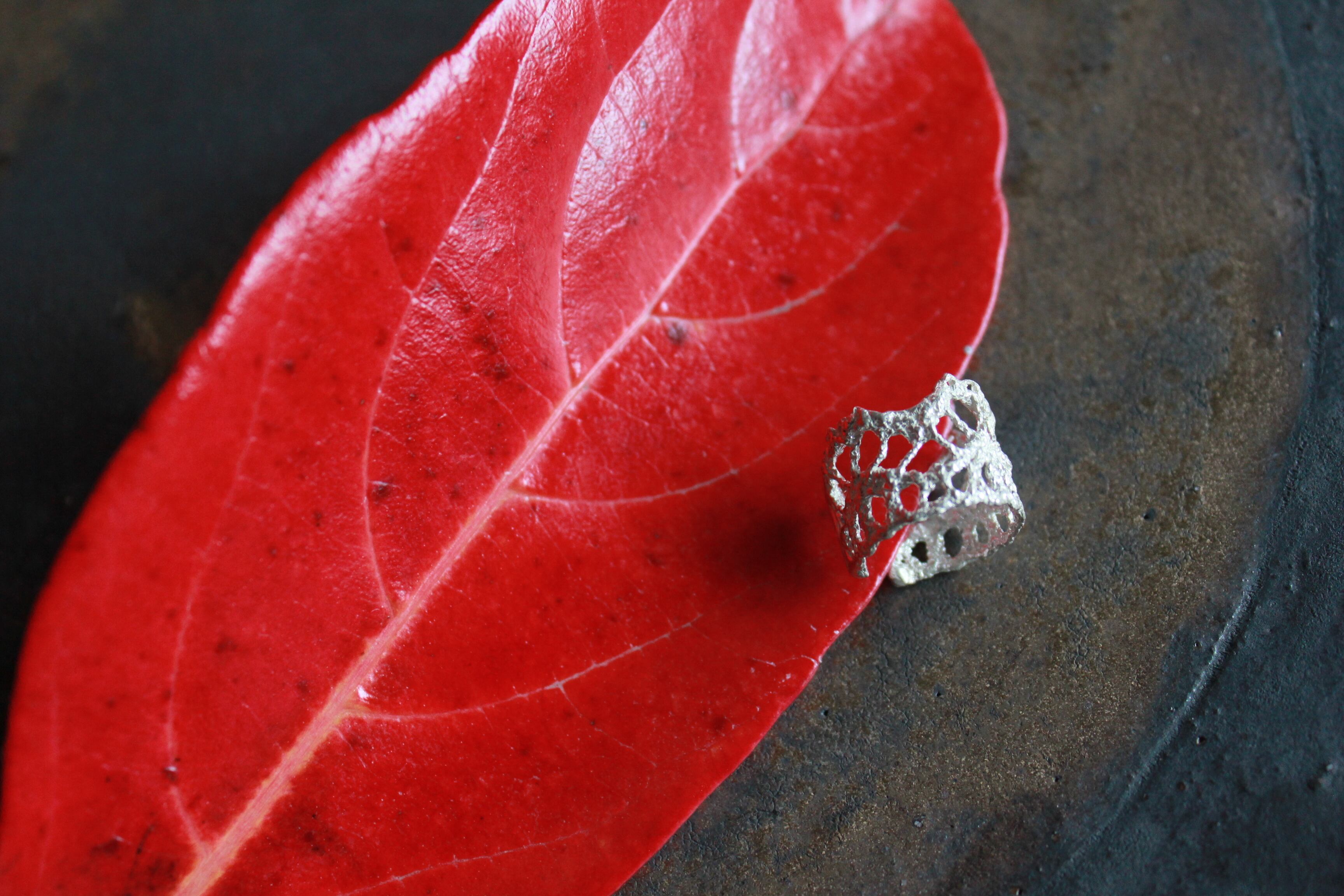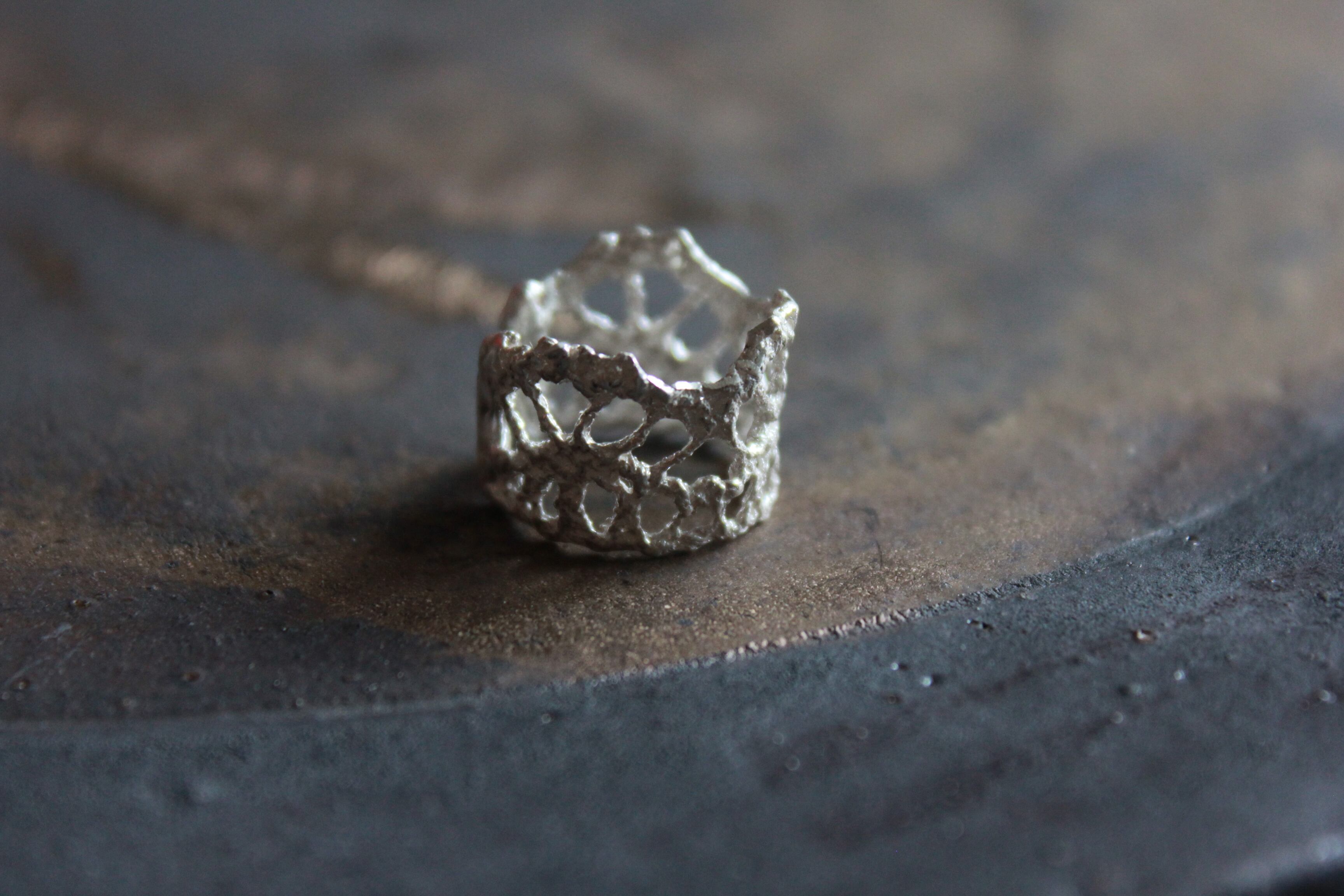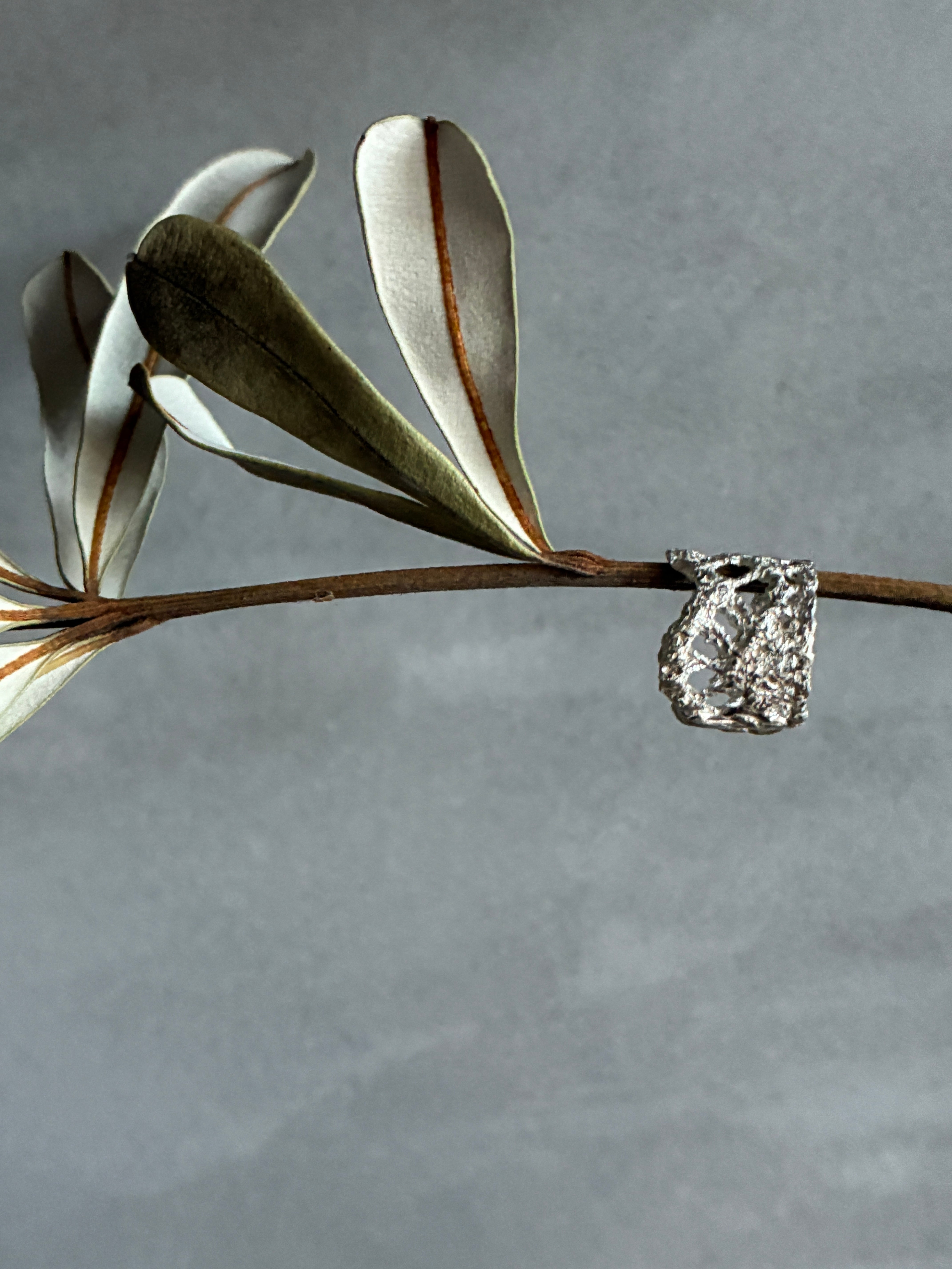 レースが持つ繊細な質感をそのまま形にしたいと思い立ち、特殊な技法で金属に鋳造しました。